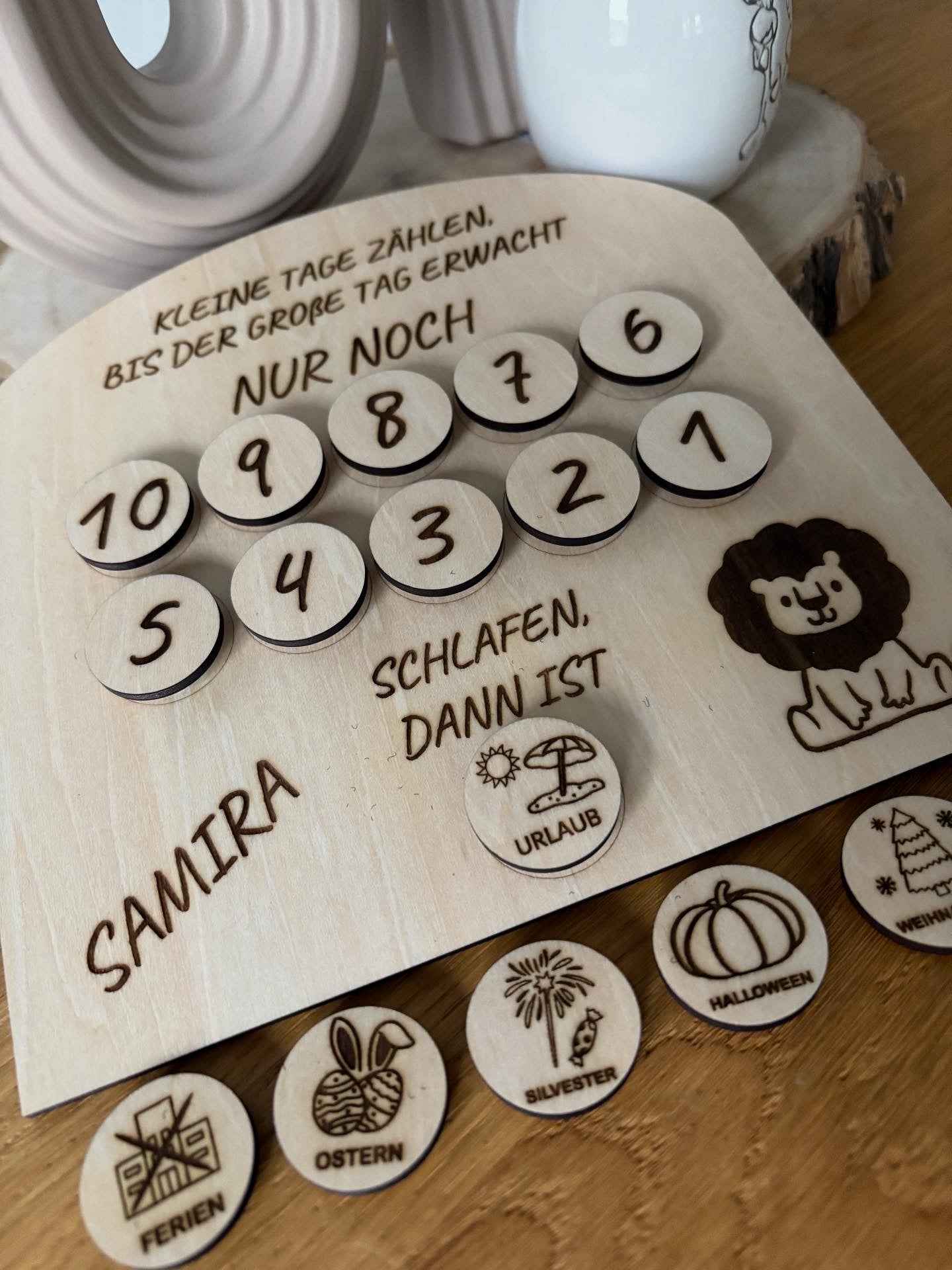 🦁 Countdown-Holz für Kinder – „Kleine Tage zählen, bis der große Tag erwacht“ – personalisiert mit Namen & Tiermotiv