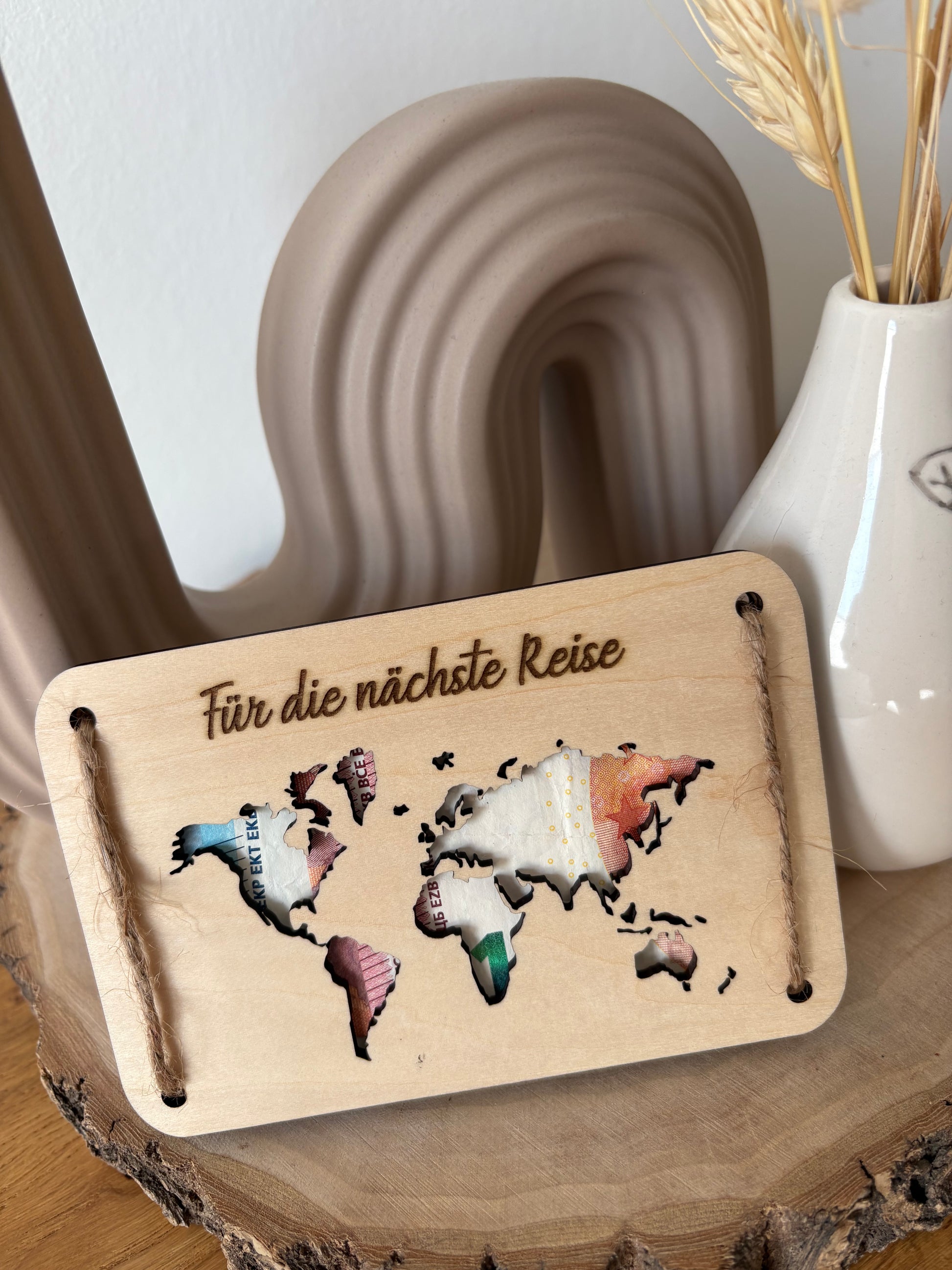 Die Karte ist mit der liebevollen Aufschrift „Für die nächste Reise“ versehen, wobei die Weltkarte kunstvoll ausgeschnitten ist, sodass die Geldscheine im Inneren der Karte sichtbar sind. Dies verleiht dem Geschenk eine persönliche Note und sorgt für einen Wow-Effekt beim Beschenken.