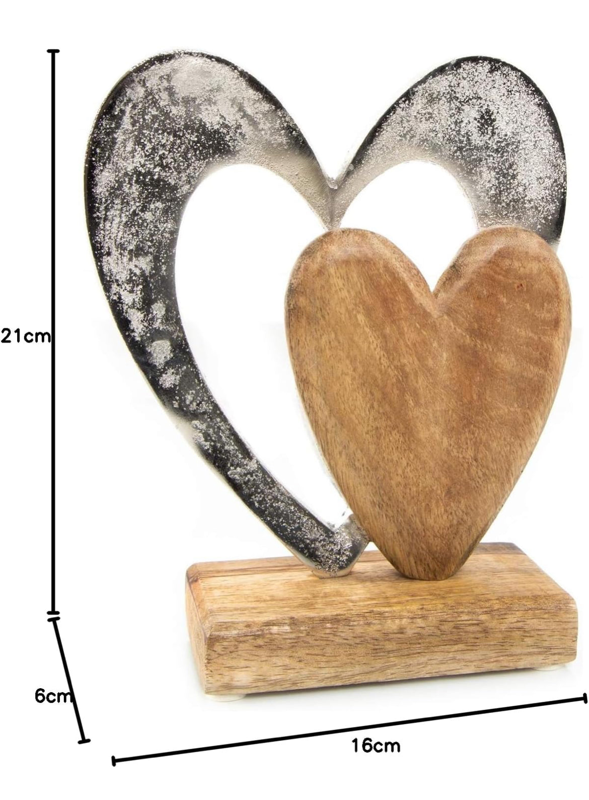 Dieser wunderschöne Herz-Aufsteller in stilvollem Braun und Silber ist ein echter Blickfang und das perfekte Geschenk für besondere Anlässe wie Hochzeiten, Jubiläen oder Valentinstage. Das Dekoobjekt besteht aus zwei ineinander verschmolzenen Herzen – eines aus edlem Metall und eines aus warmem Holz – die gemeinsam auf einem stabilen Holzsockel befestigt sind.
