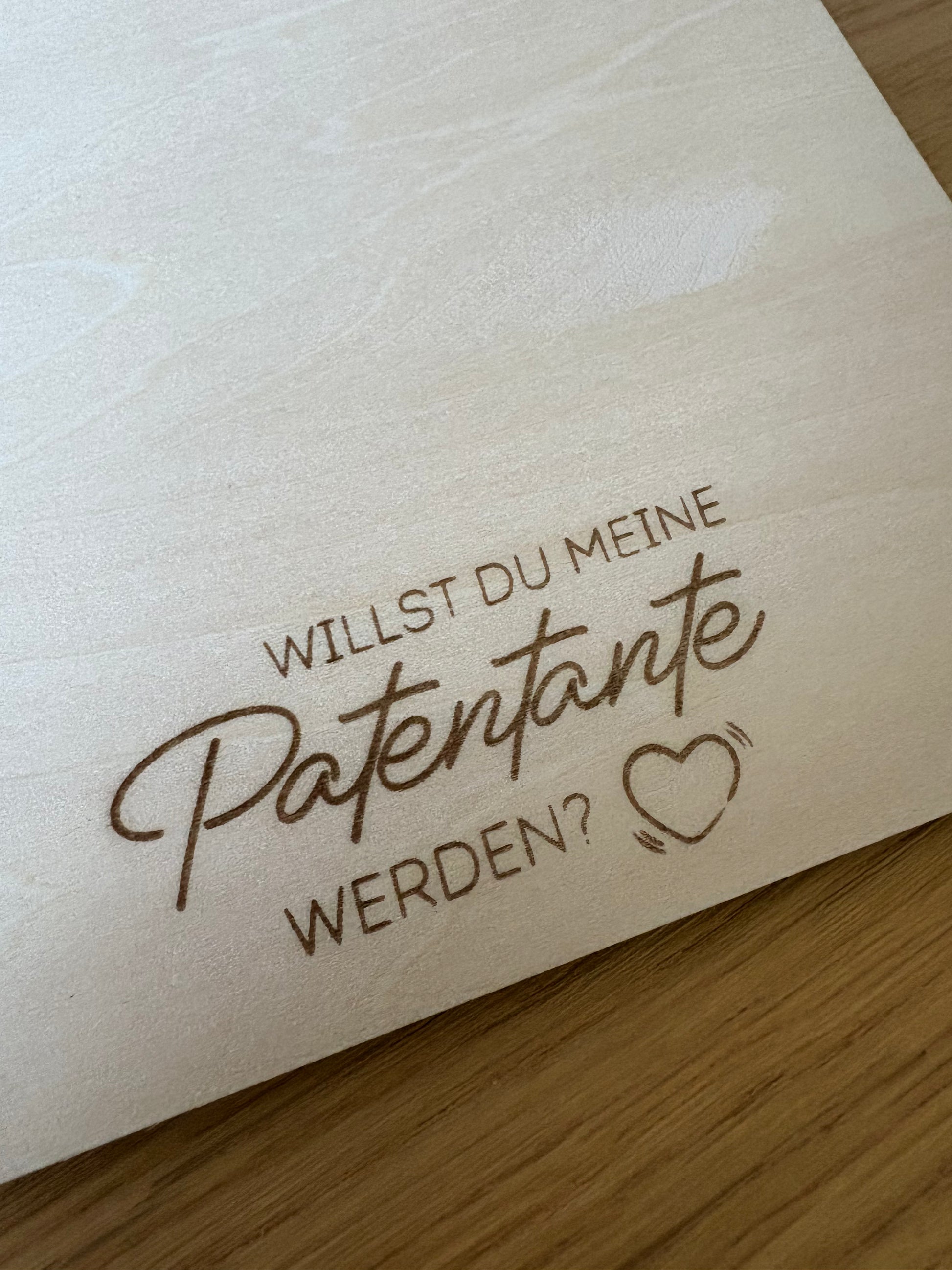 - Innenseite: Wahlweise mit „Willst du meine Patentante werden?“ oder „Willst du mein Patenonkel werden?“