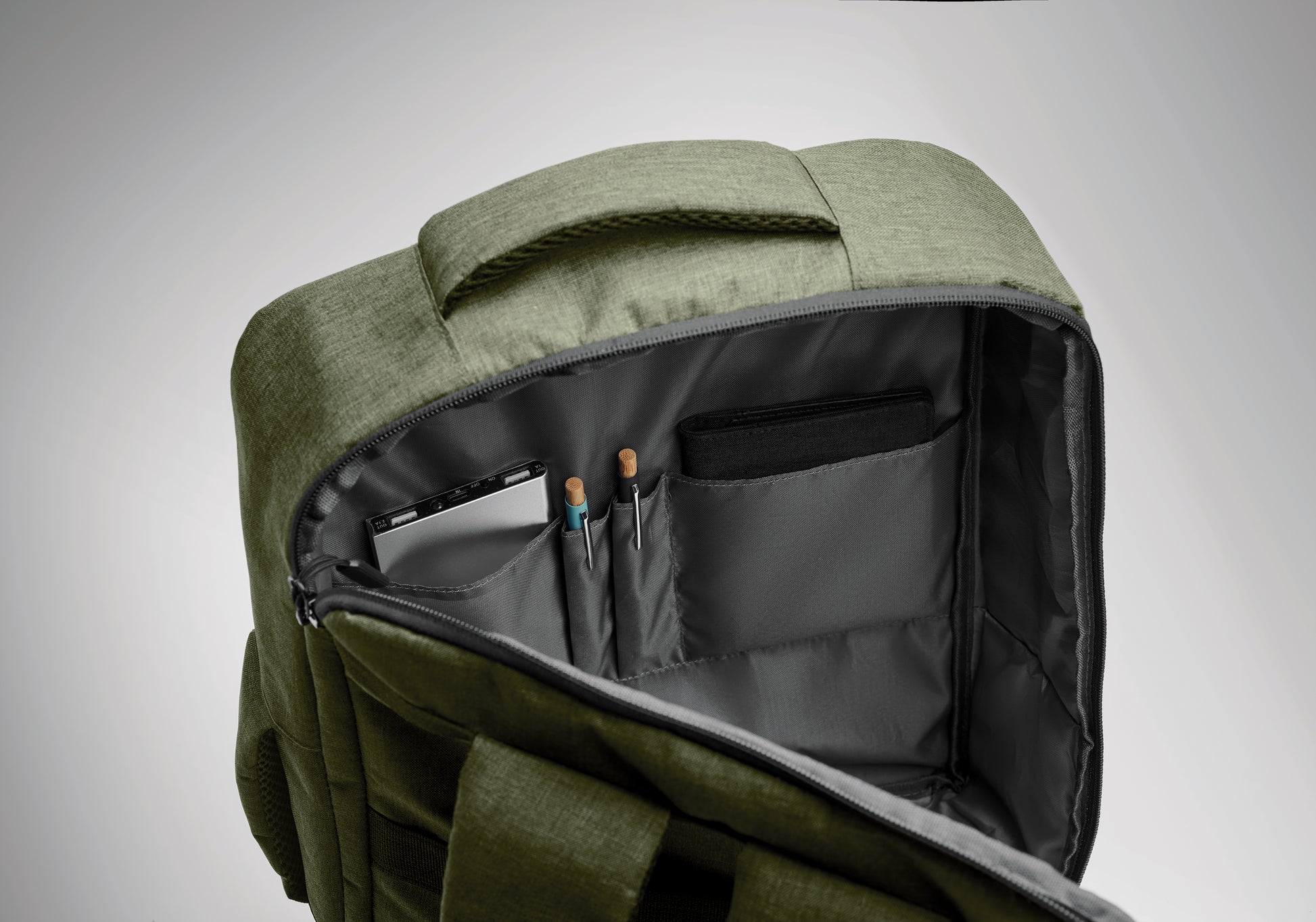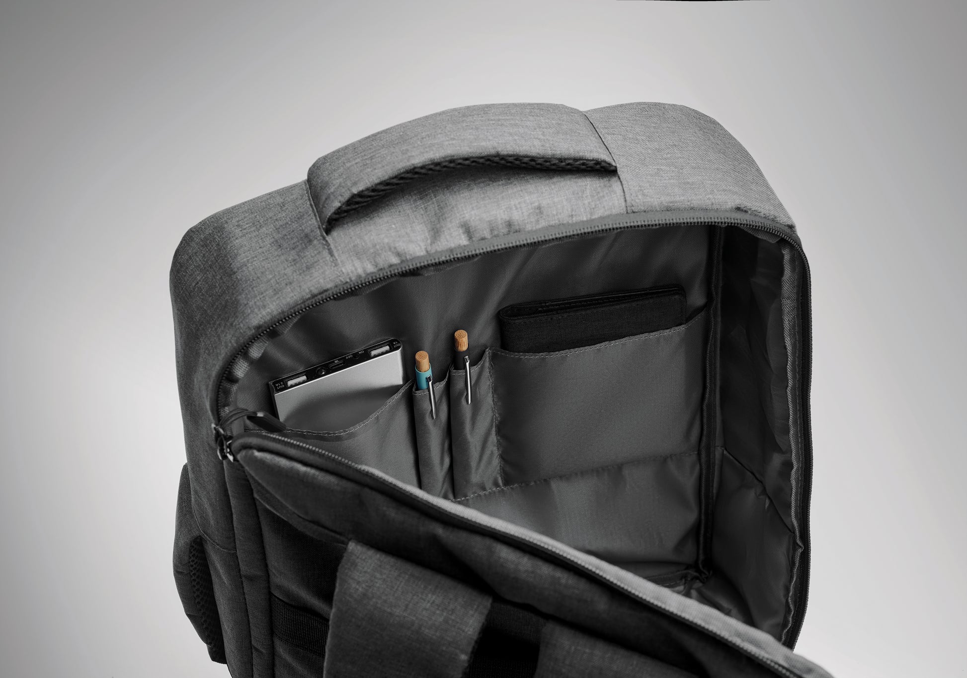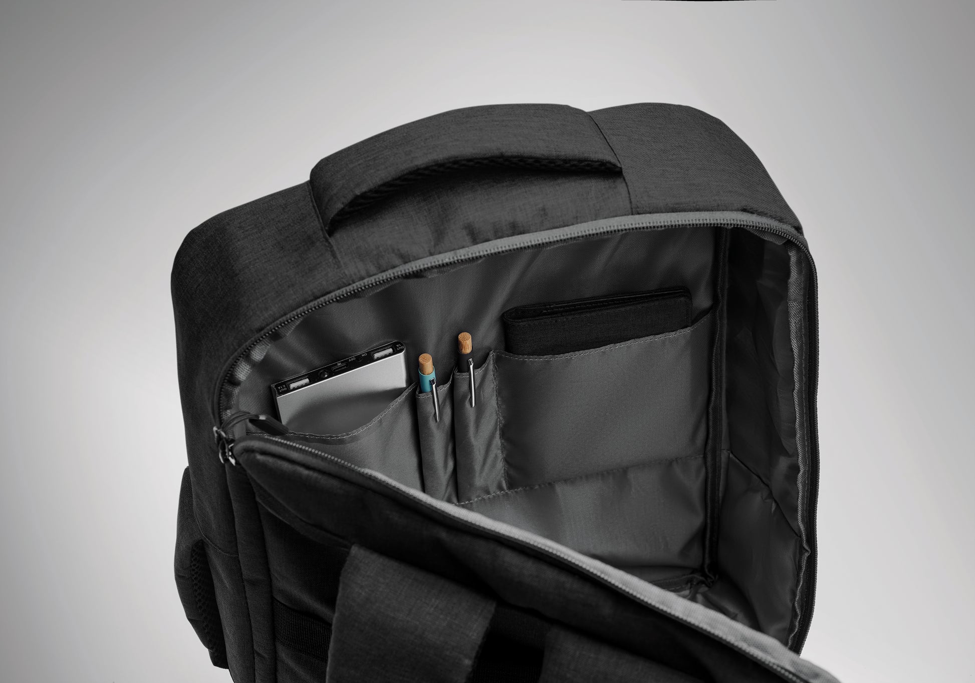 Schlanker 15'''' Laptop-Rucksack aus 300D RPET mit 210D RPET-Futter. Laptopfach 2 Innentaschen
