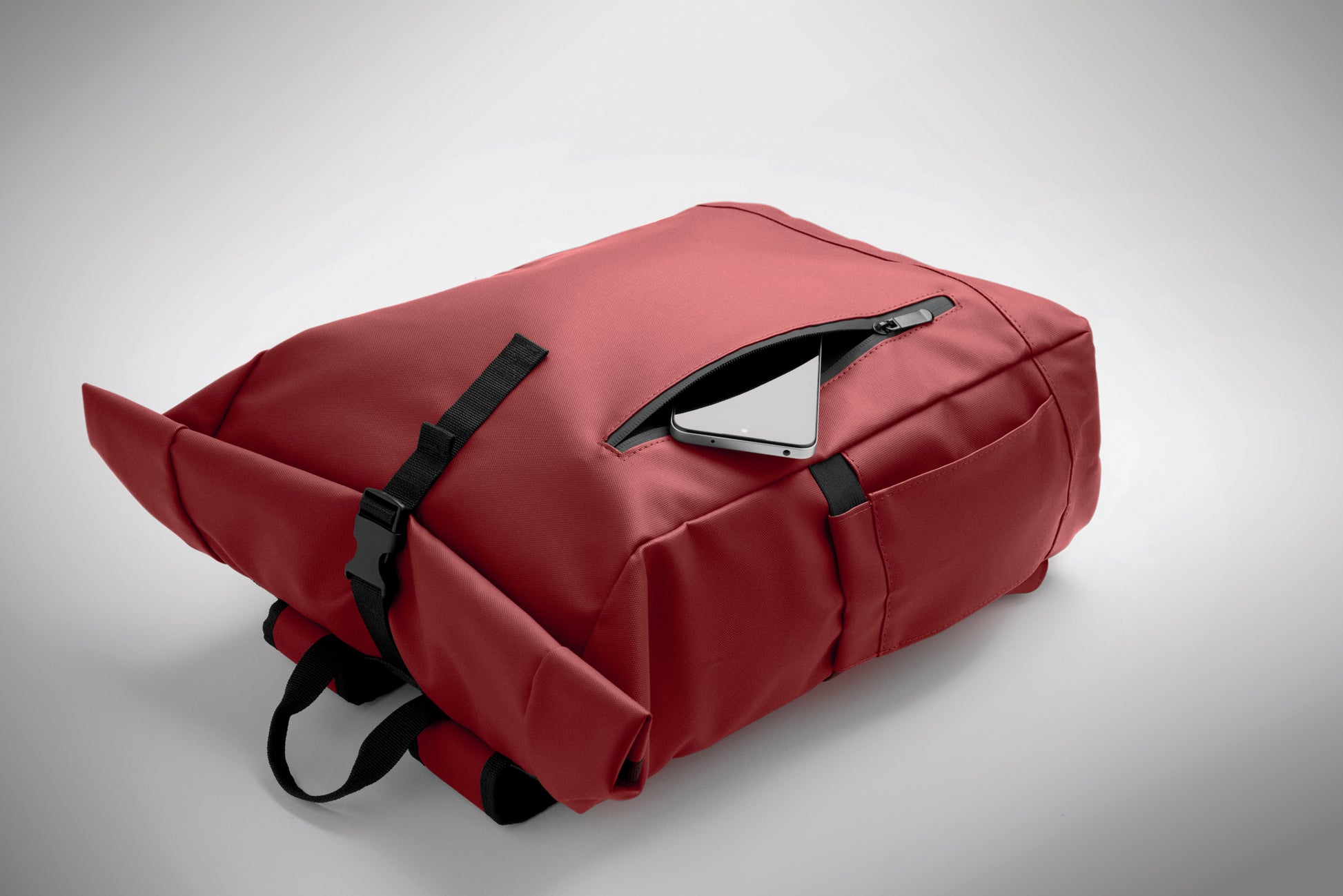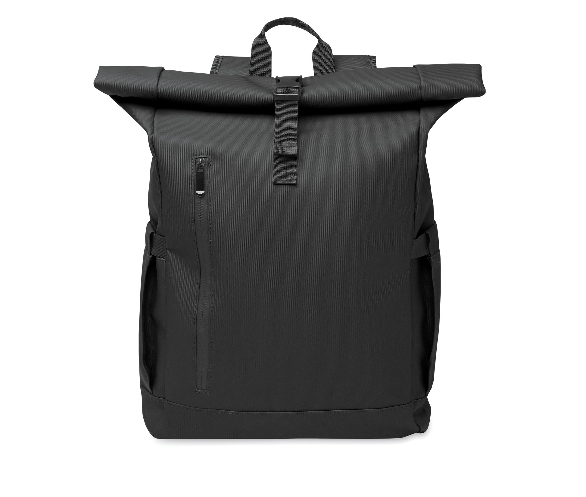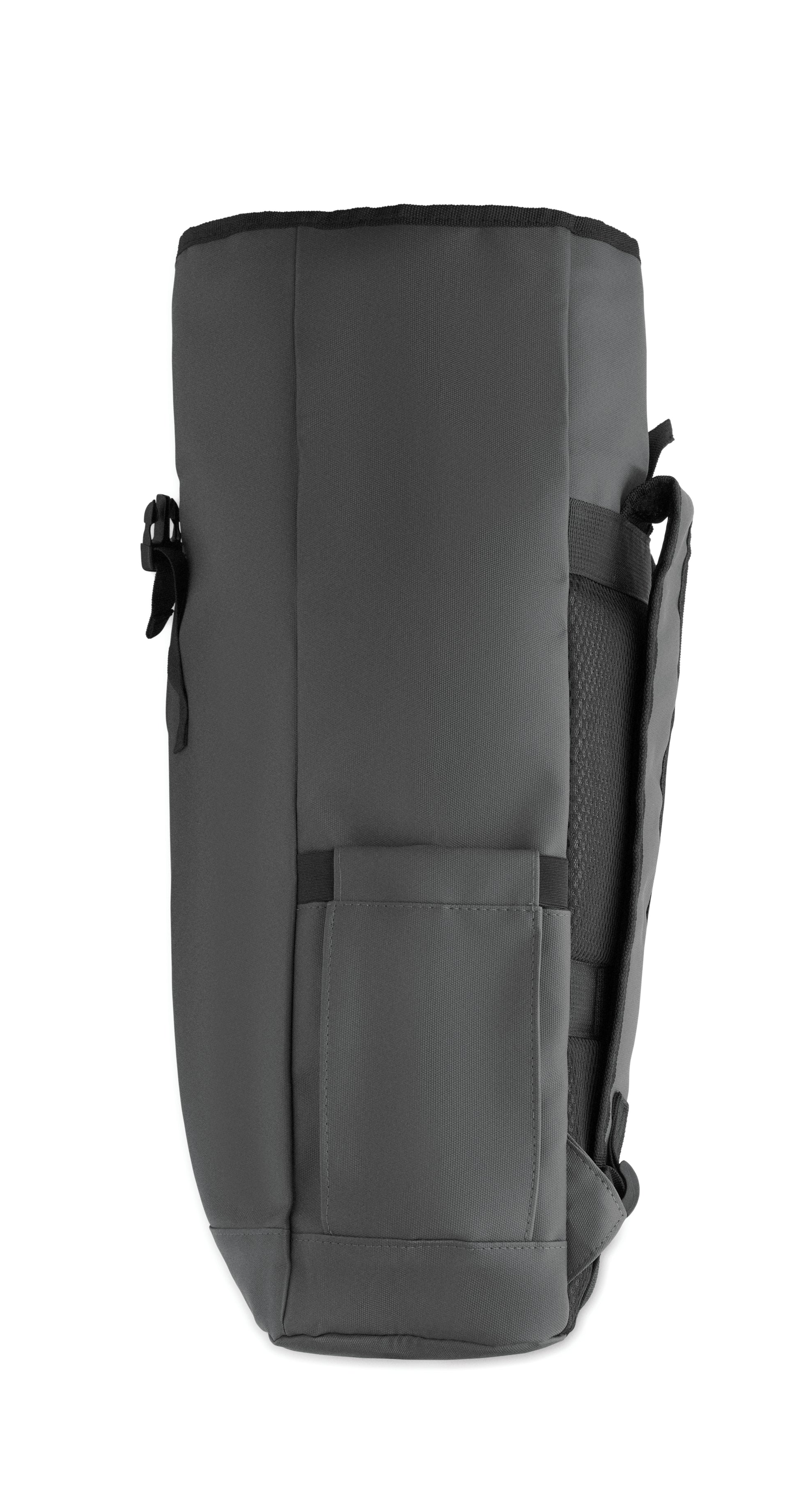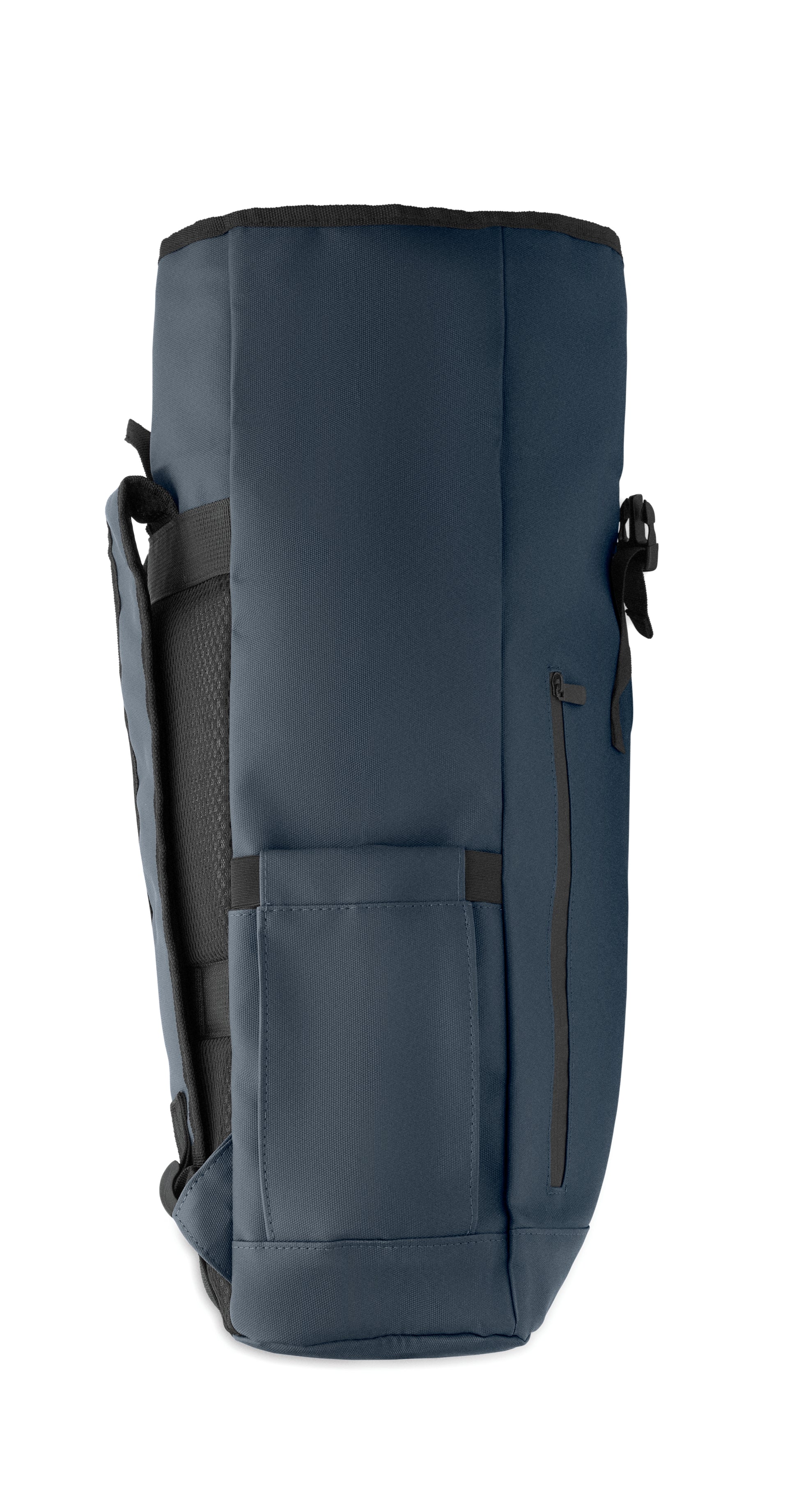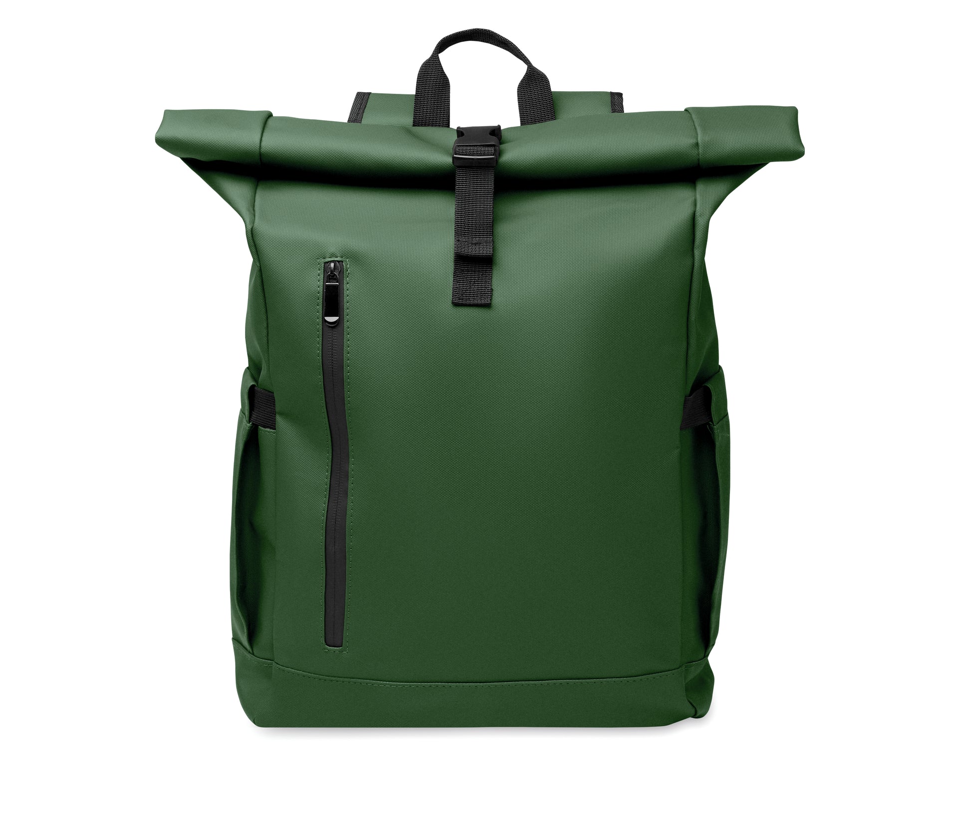 Rolltop-Rucksack aus PU-beschichtetem 600D RPET-Polyester und RPET-Polyesterfutter. 15'' Laptop-Fach. Gepolsterter Netzrücken mit Reißverschlusstasche und Trolley-Halterung. Gepolsterte Schultergurte mit Mesh-Finish-Innenseite.