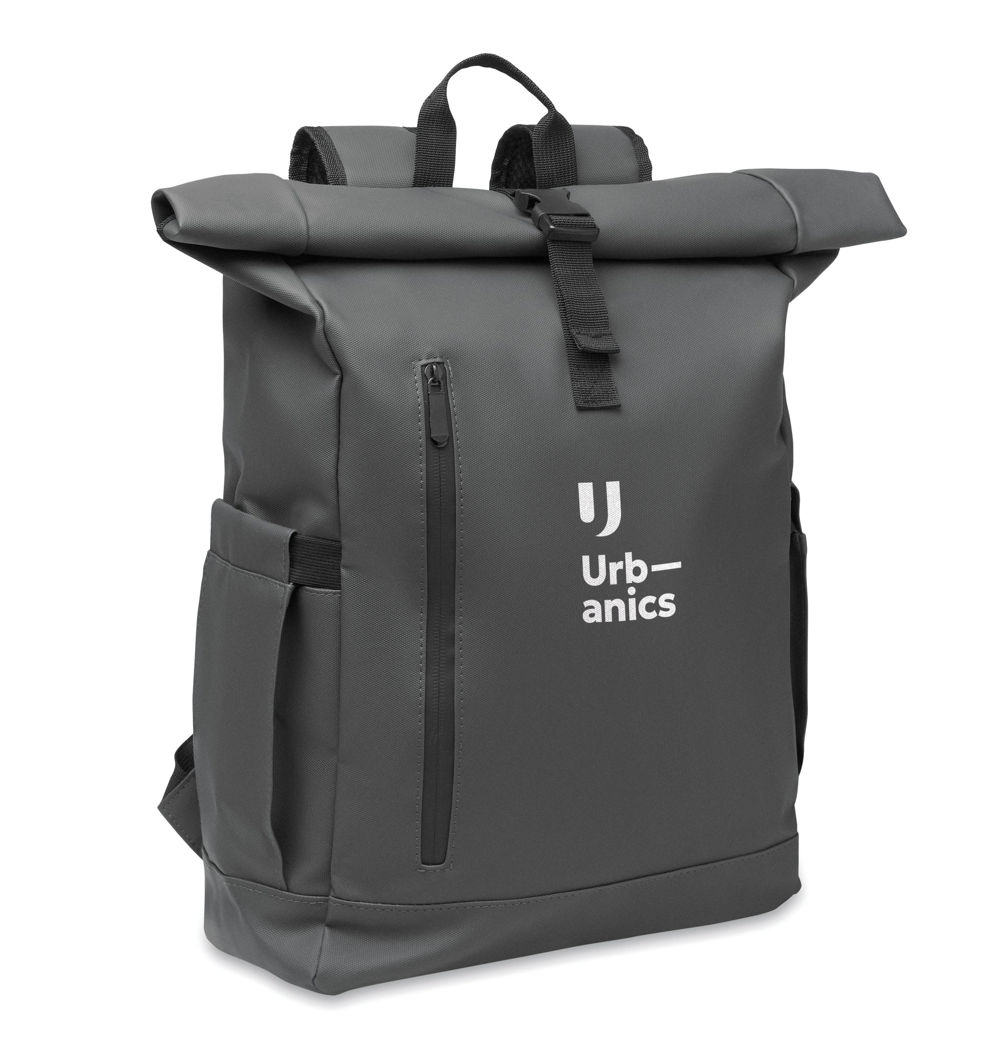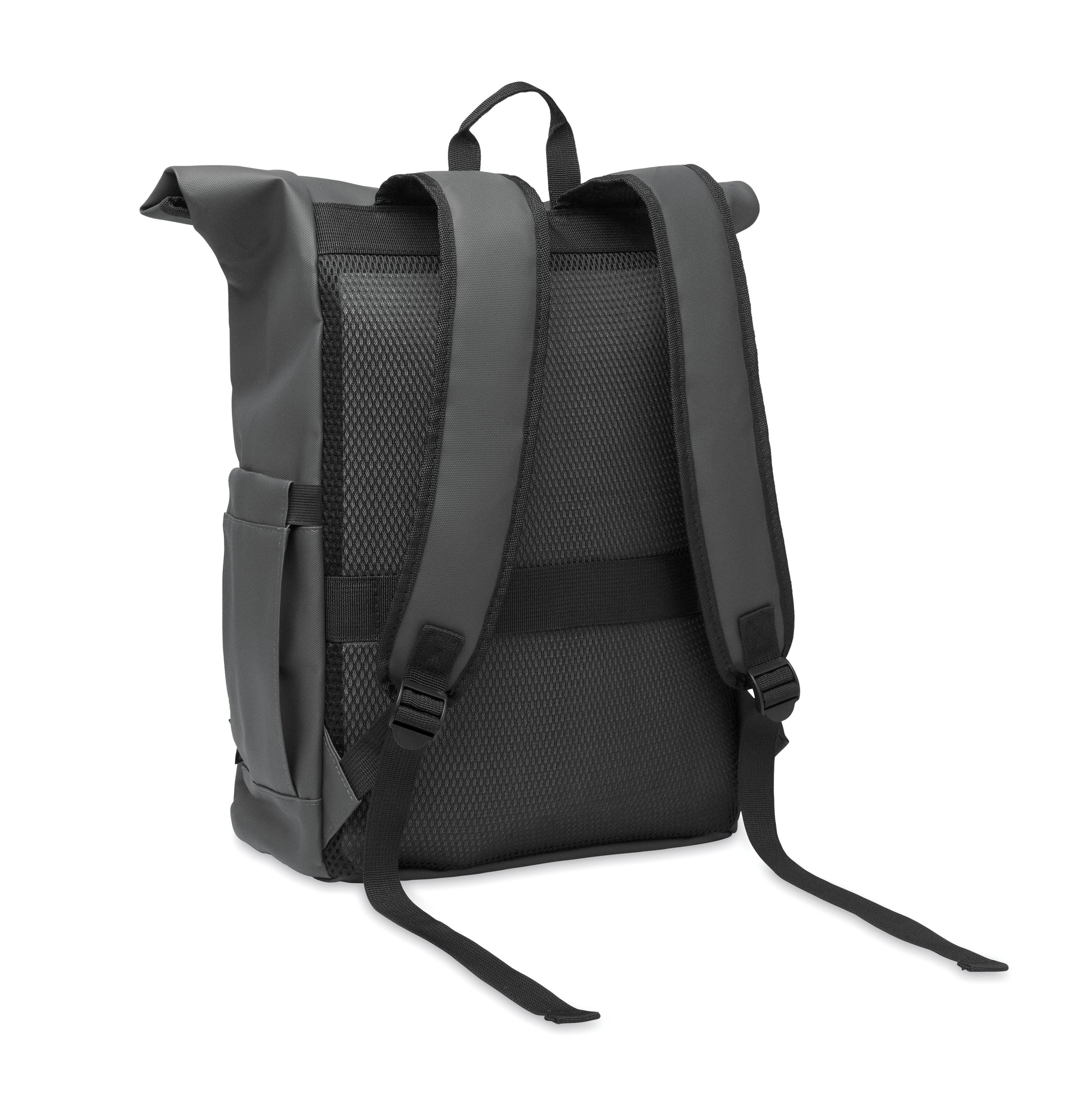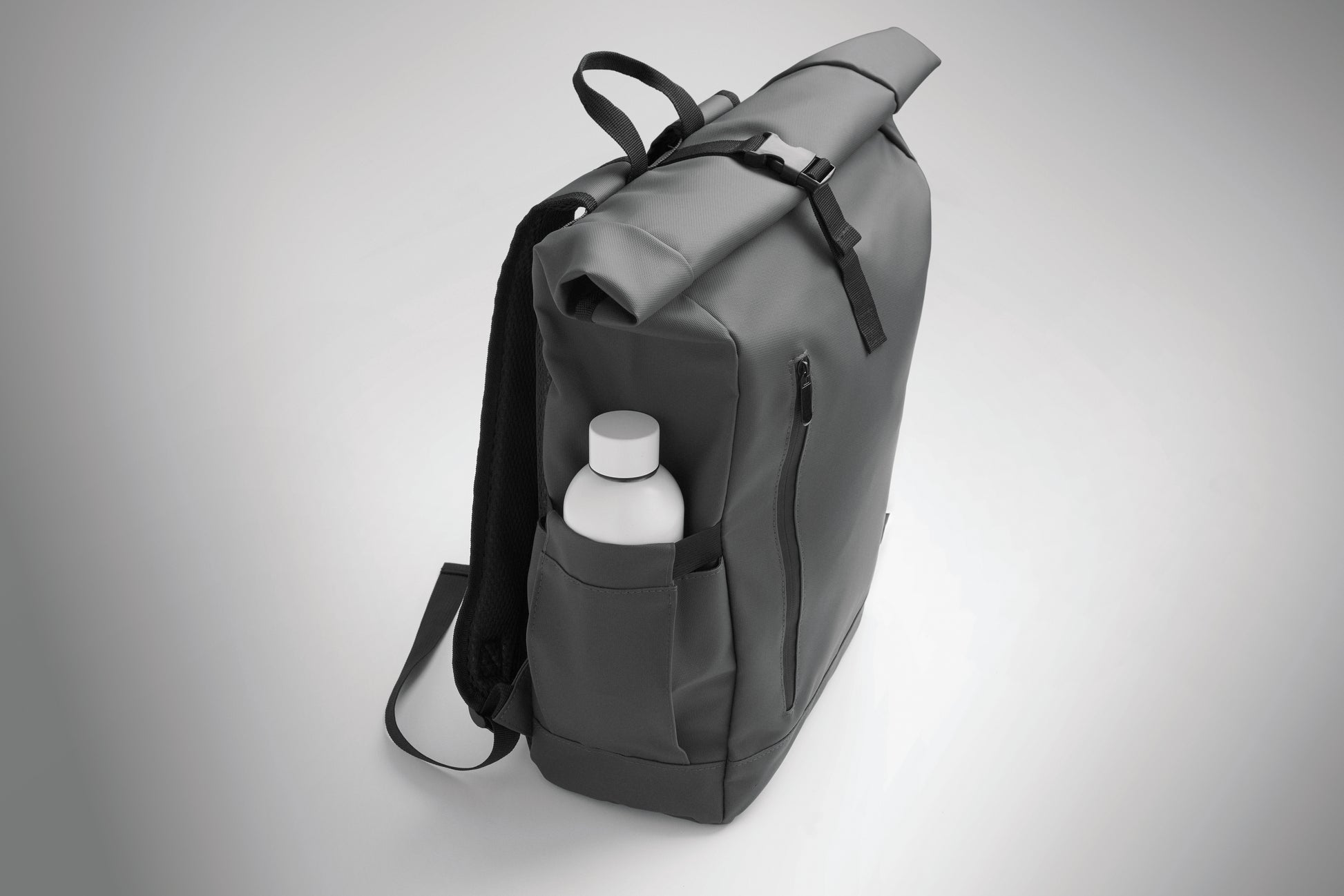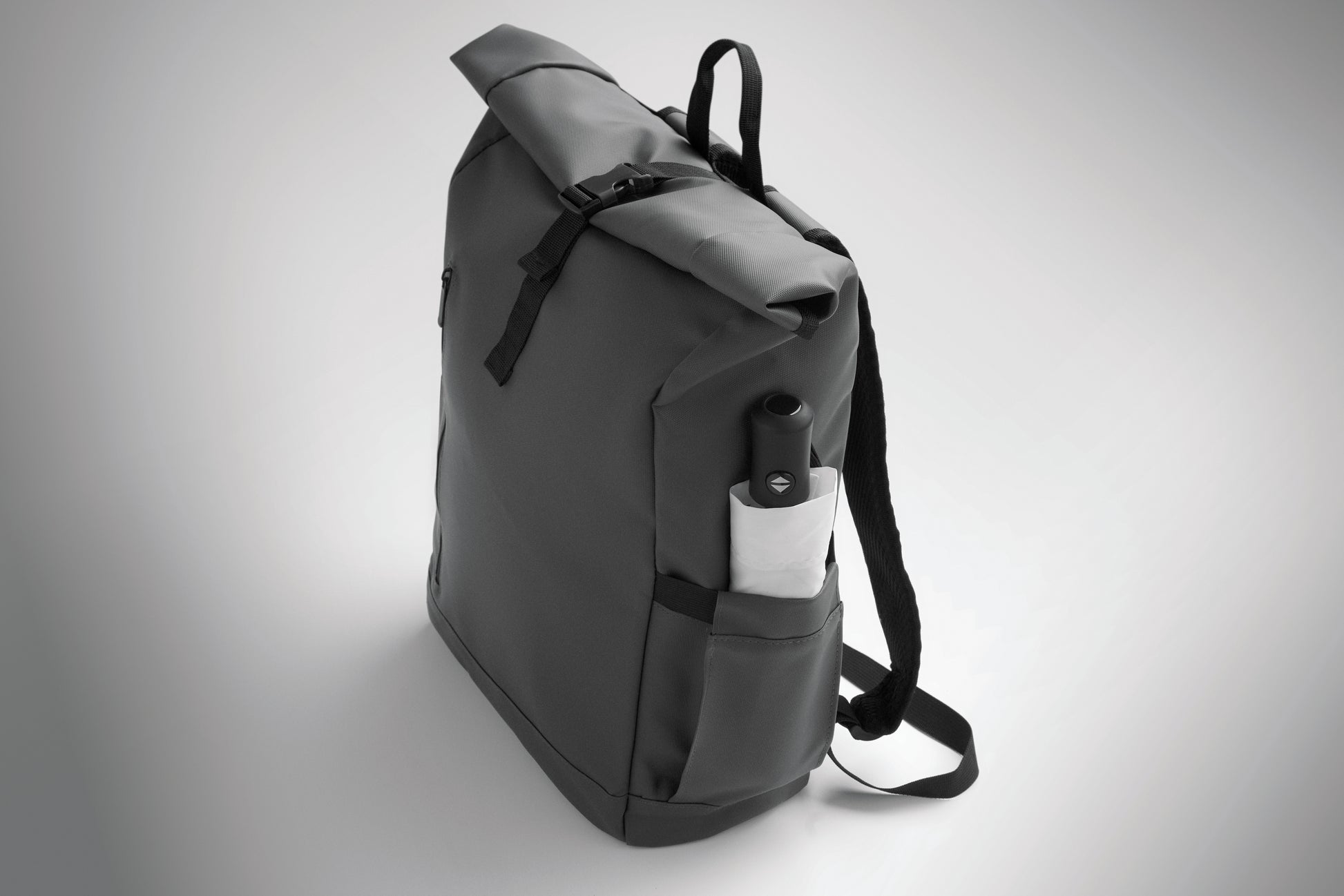 Rolltop-Rucksack aus PU-beschichtetem 600D RPET-Polyester und RPET-Polyesterfutter. 15'' Laptop-Fach. Gepolsterter Netzrücken mit