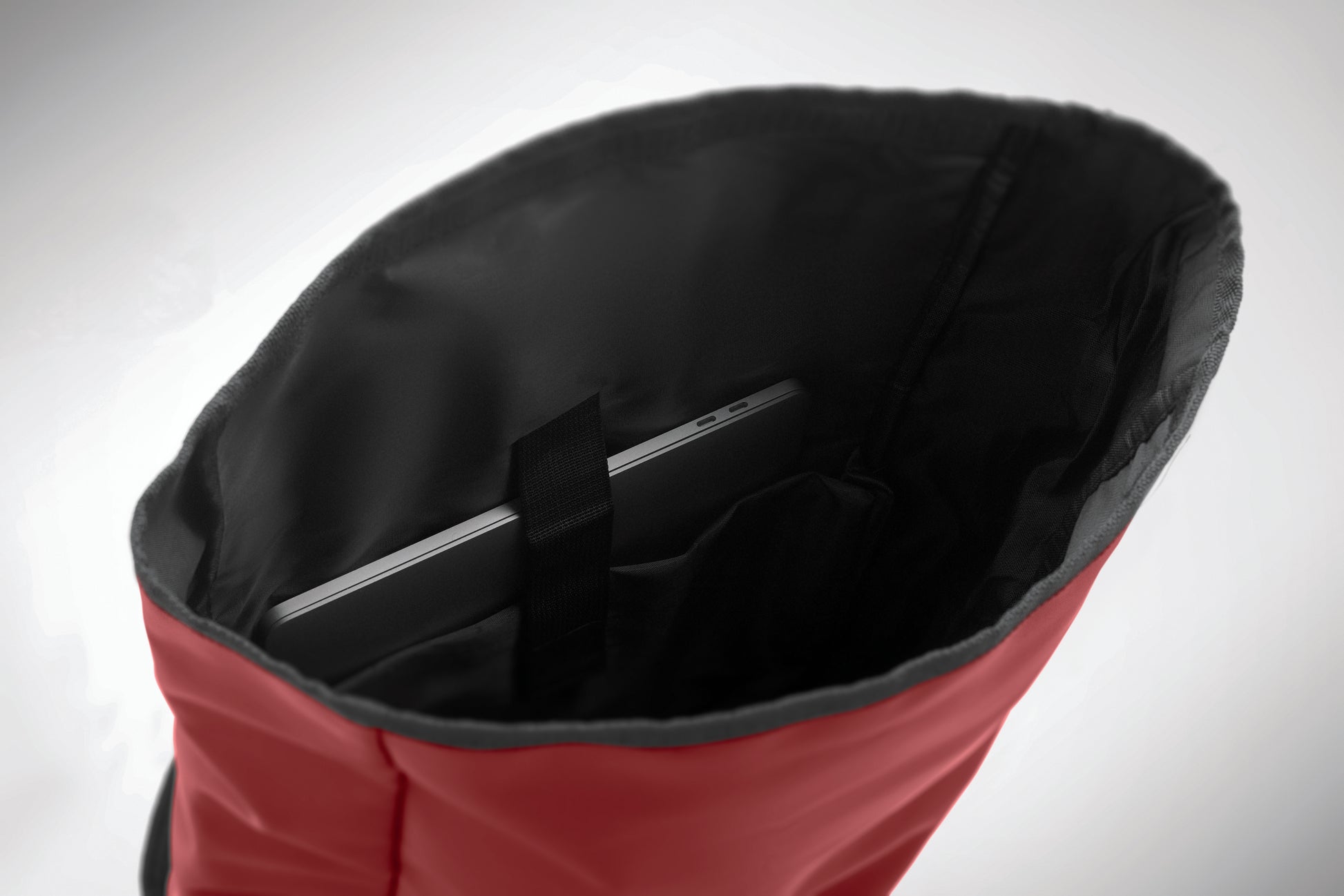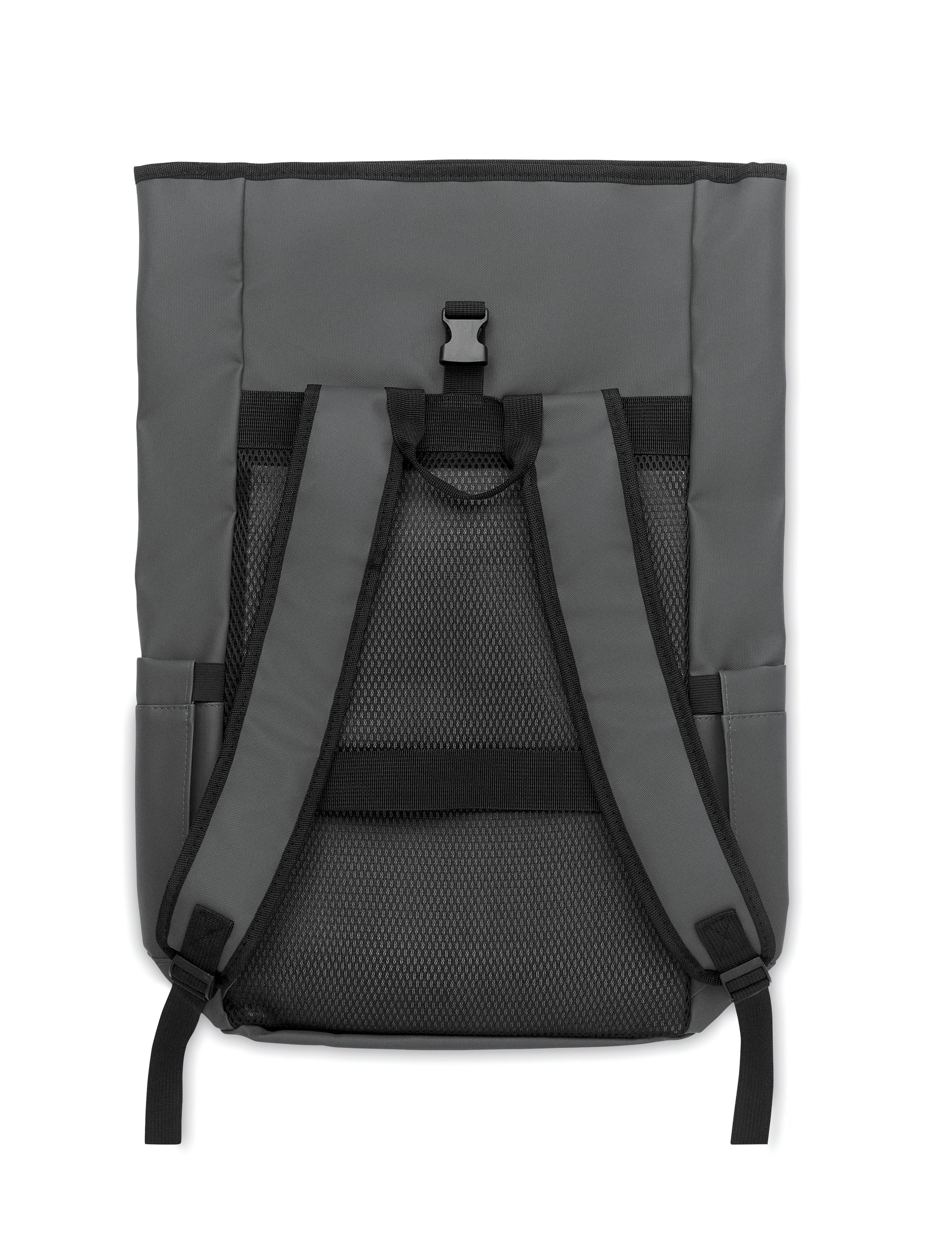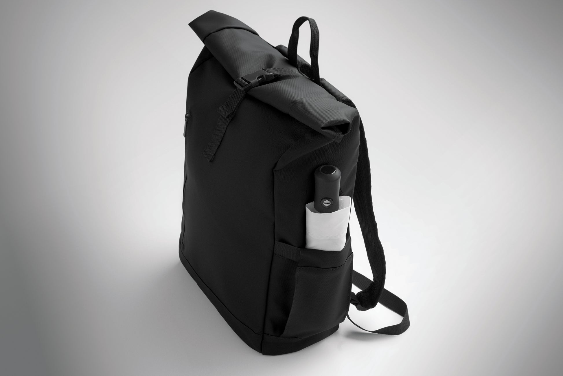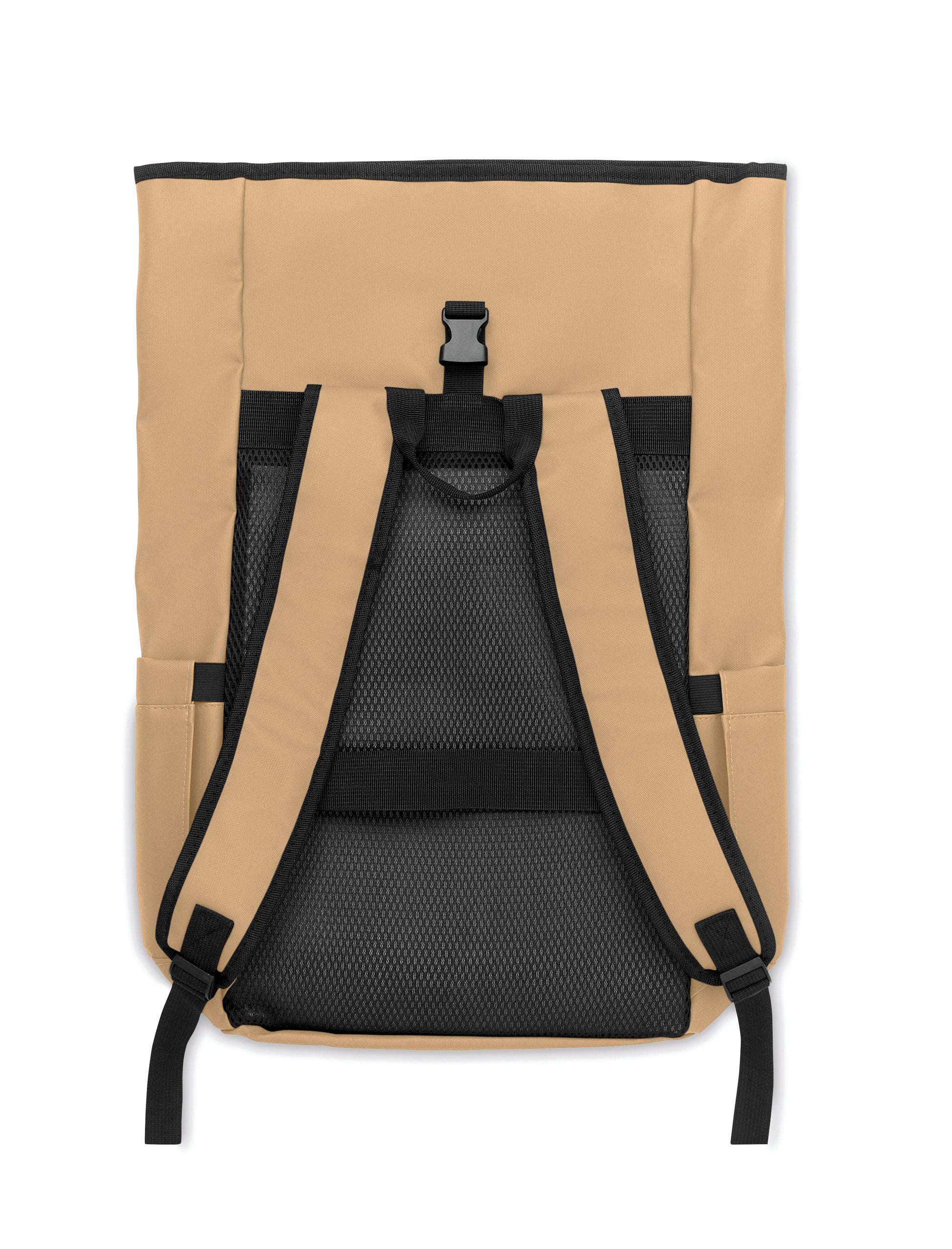 Rolltop-Rucksack aus PU-beschichtetem 600D RPET-Polyester und RPET-Polyesterfutter. 15'' Laptop-Fach. Gepolsterter Netzrücken mit