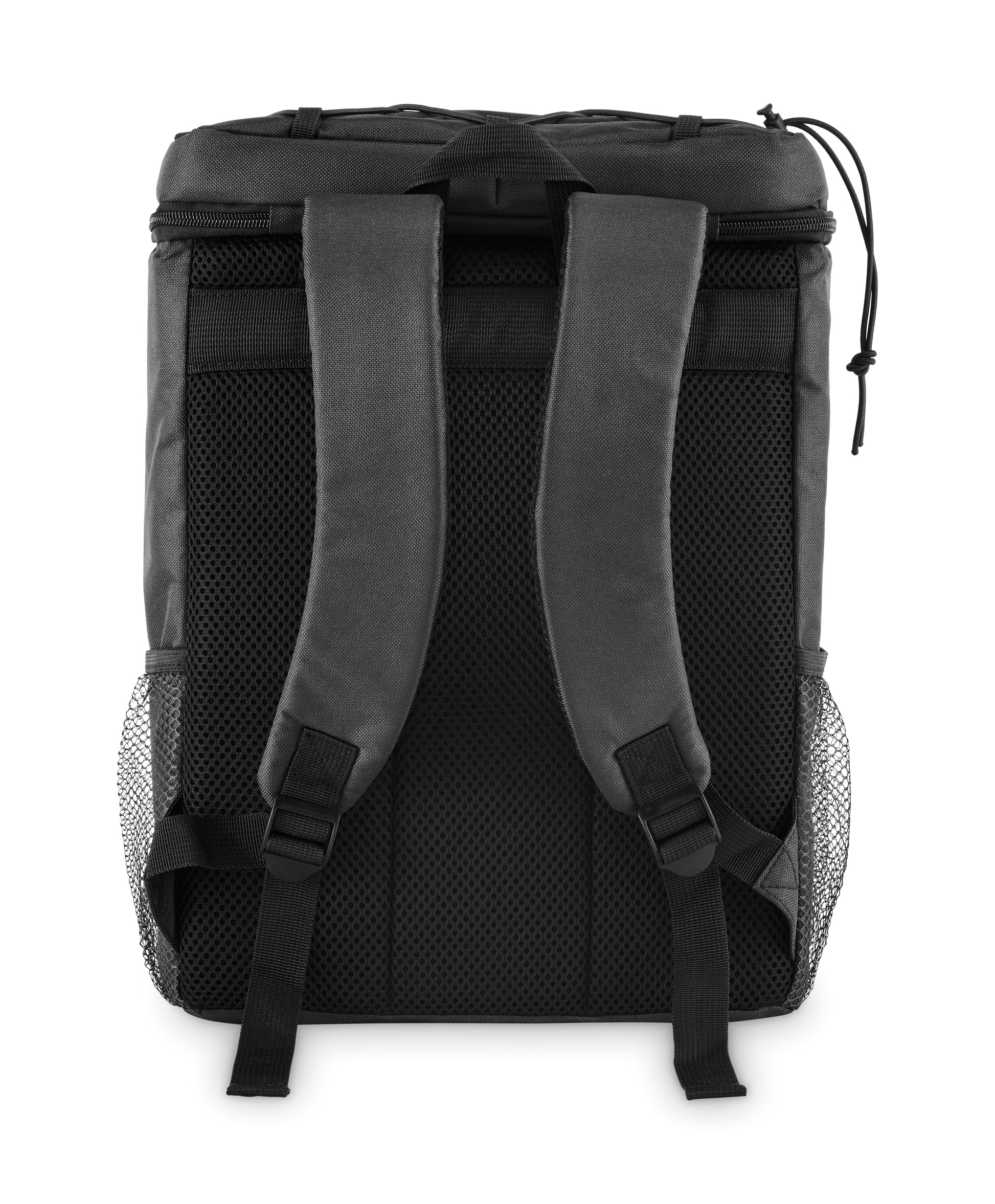 Kühlrucksack aus 600D RPET Polyester mit PEVA-Futter und 5 mm PE-Schaum. Fronttasche und zwei seitliche Netztaschen. Gepolsterte, verstellbare Schultergurte. Volumen: 9L.