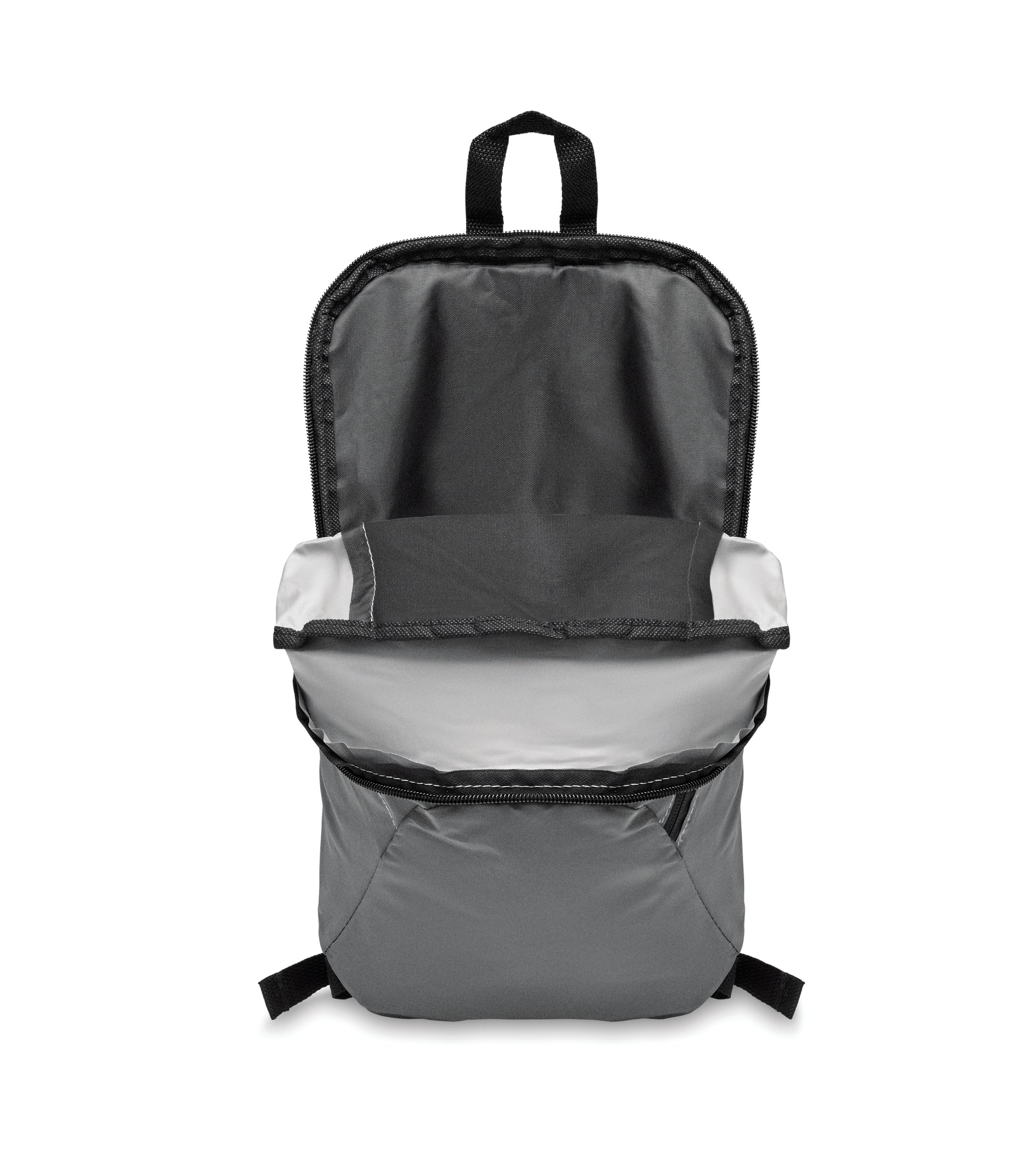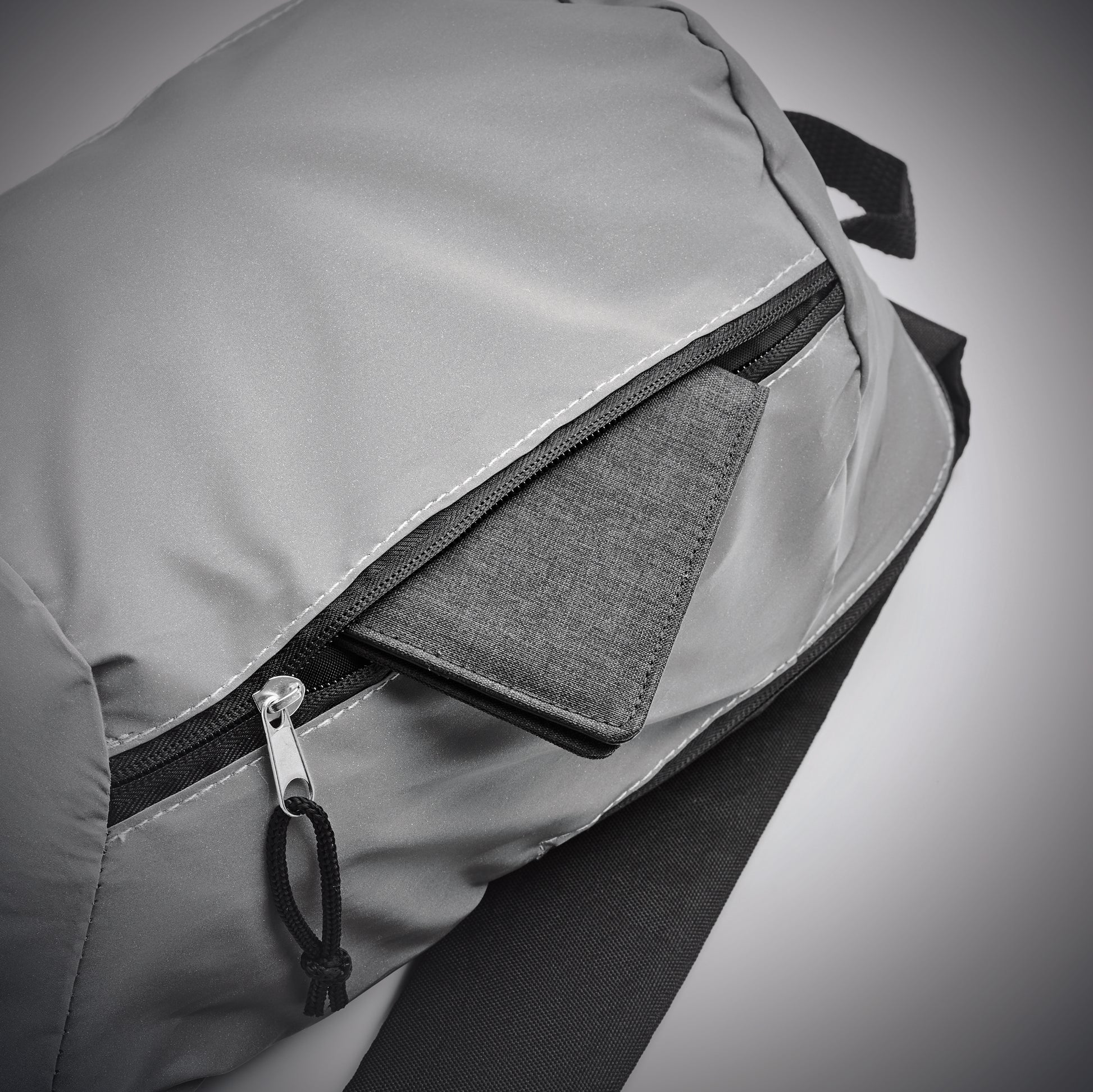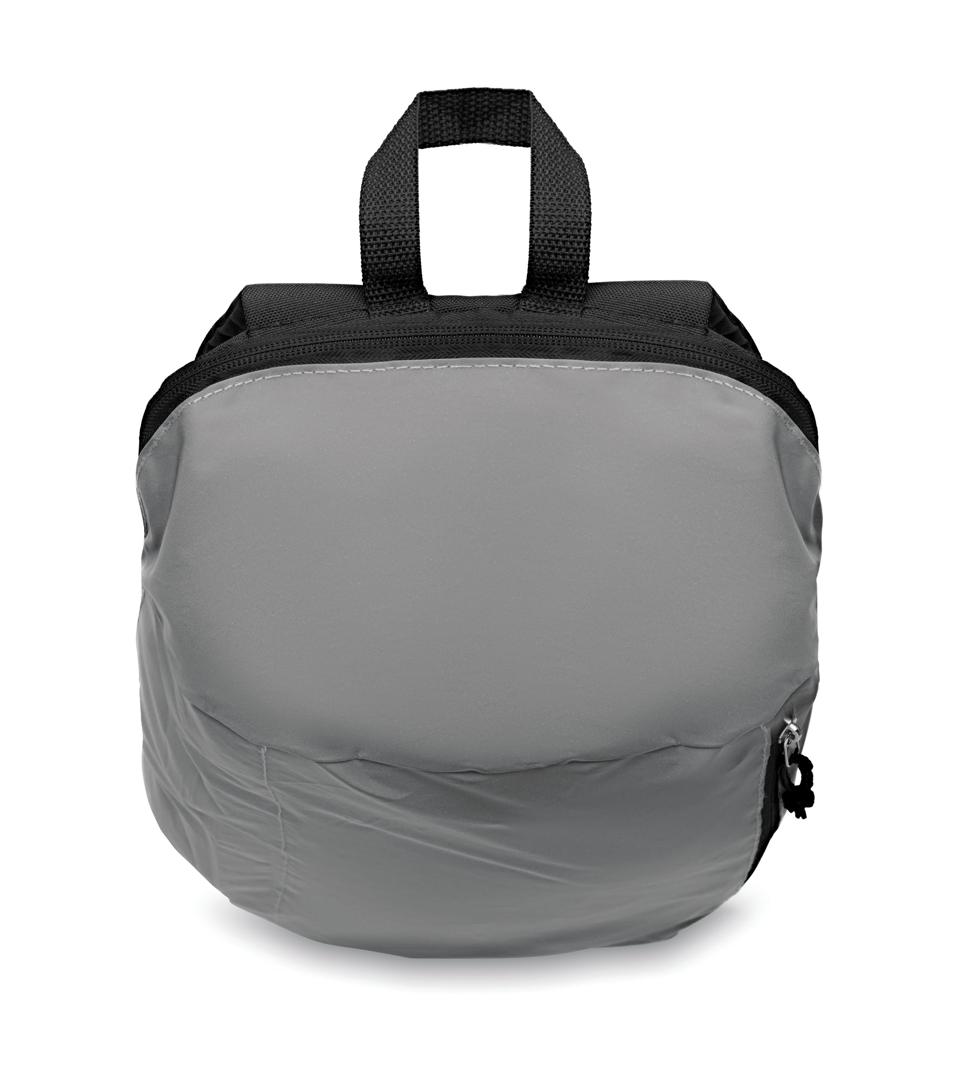 Rucksack mit Front aus hoch reflektierendem Polyester. Fronttasche mit Reißverschluss. Gepolsterte Rückseite.