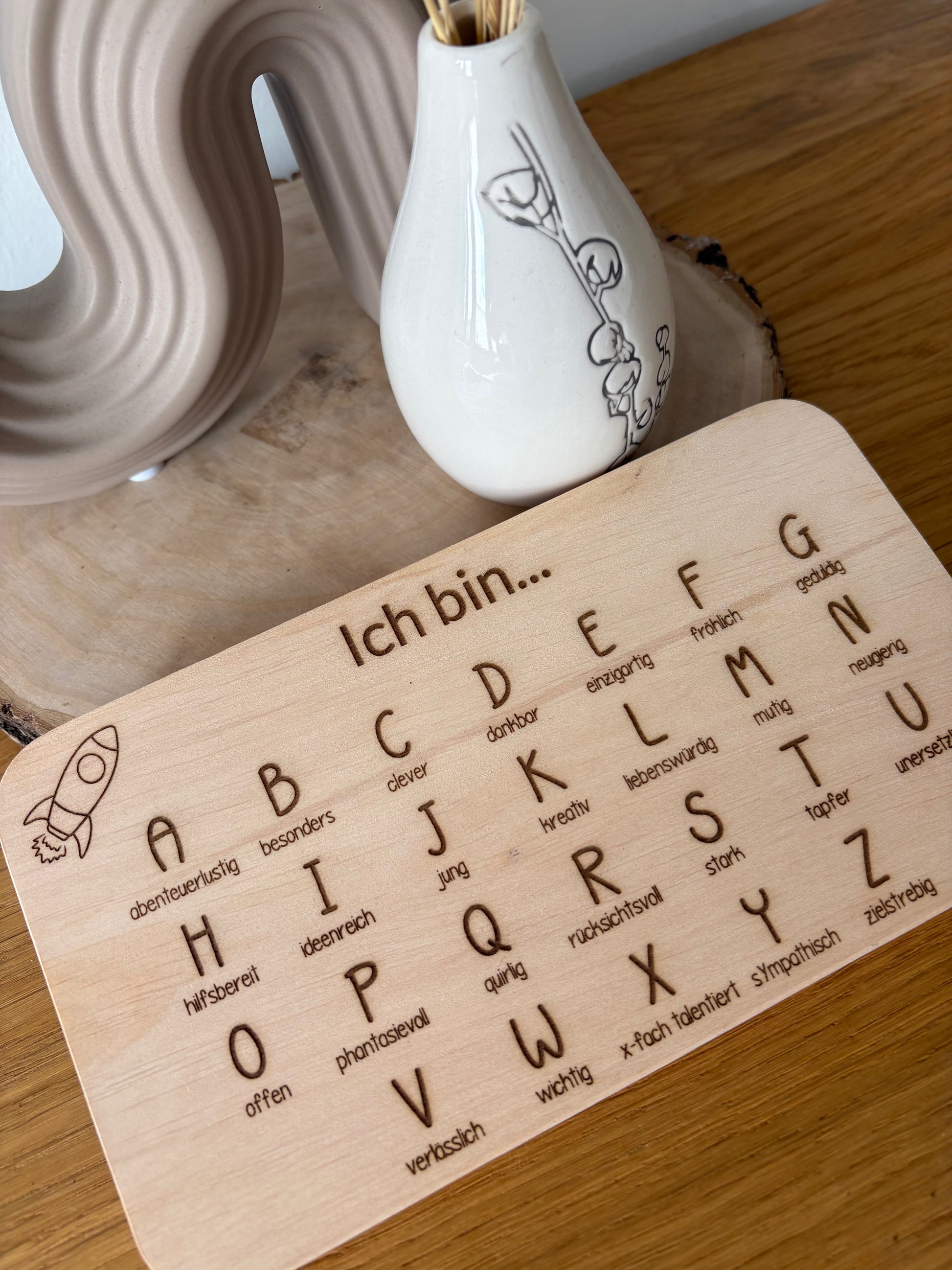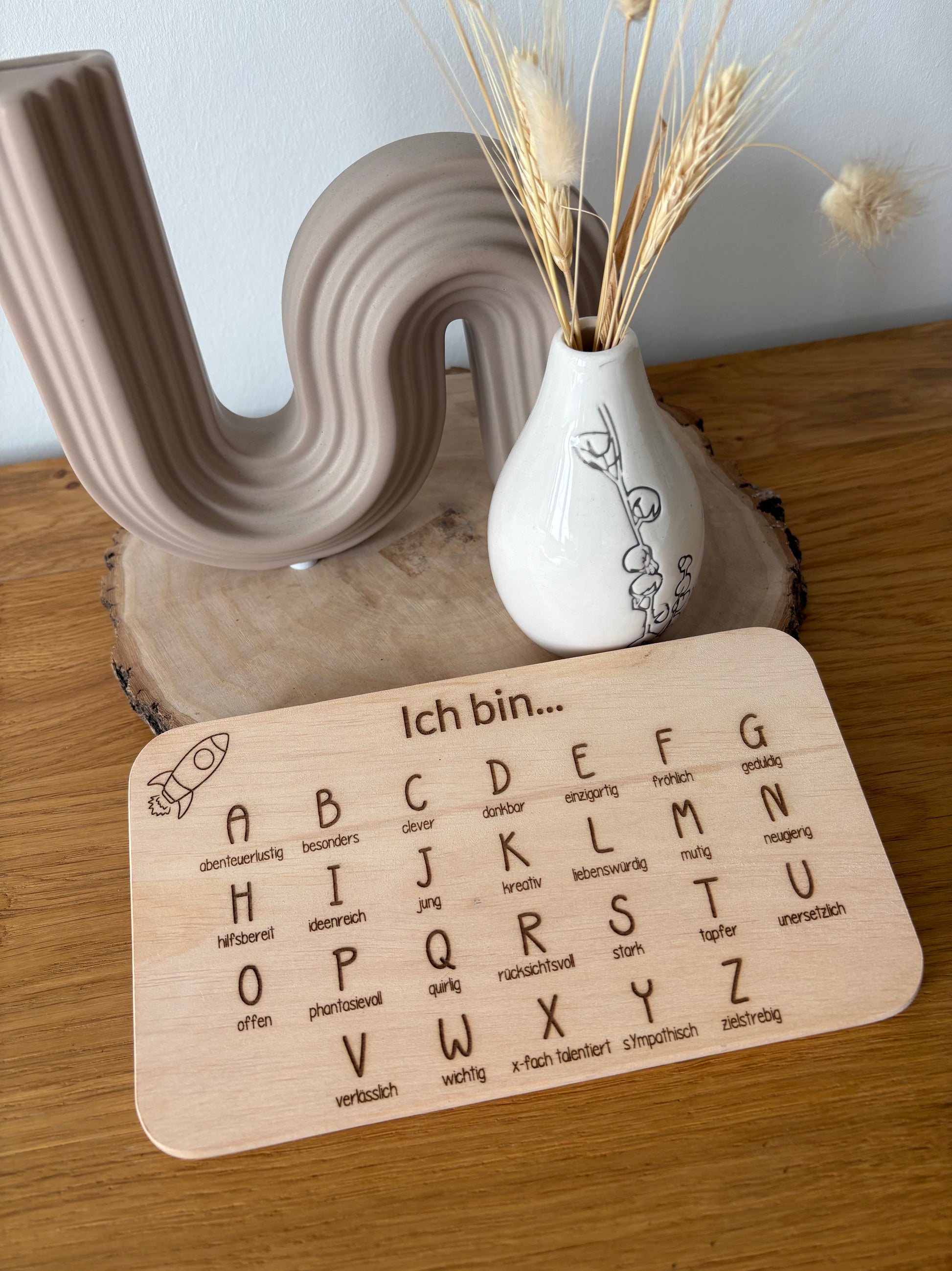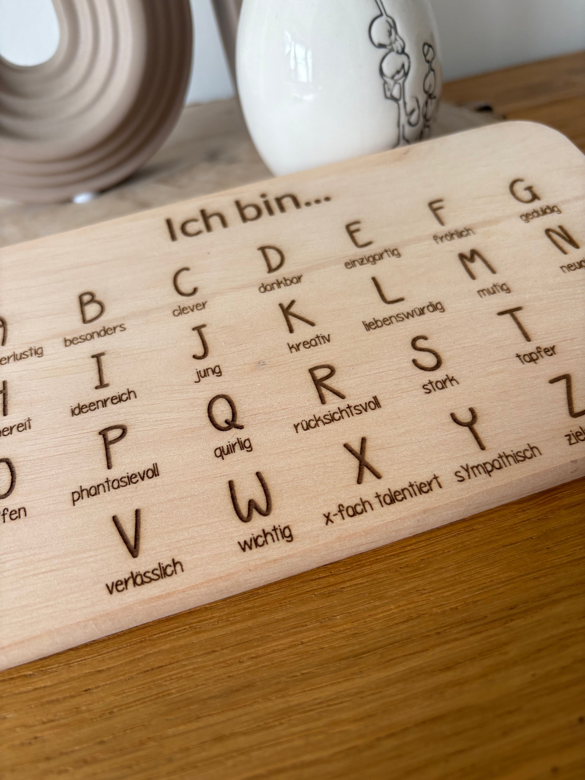 - Lasergravur: Motiv „Ich bin…“ mit positiven Eigenschaften von A bis Z