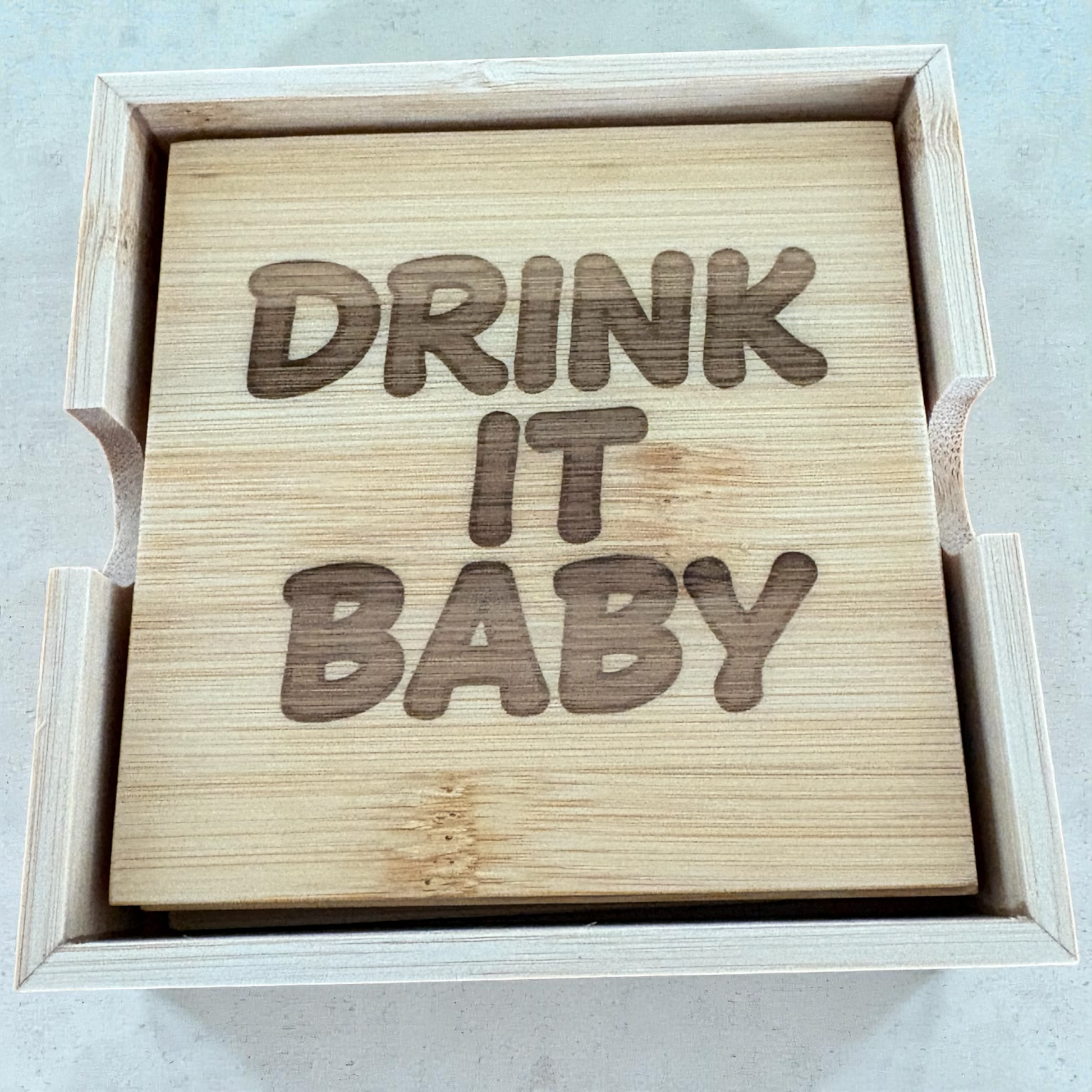 Partycrasher Bambus-Untersetzer-Set „Drink It Baby“ – Stylisch & praktisch! 🍹