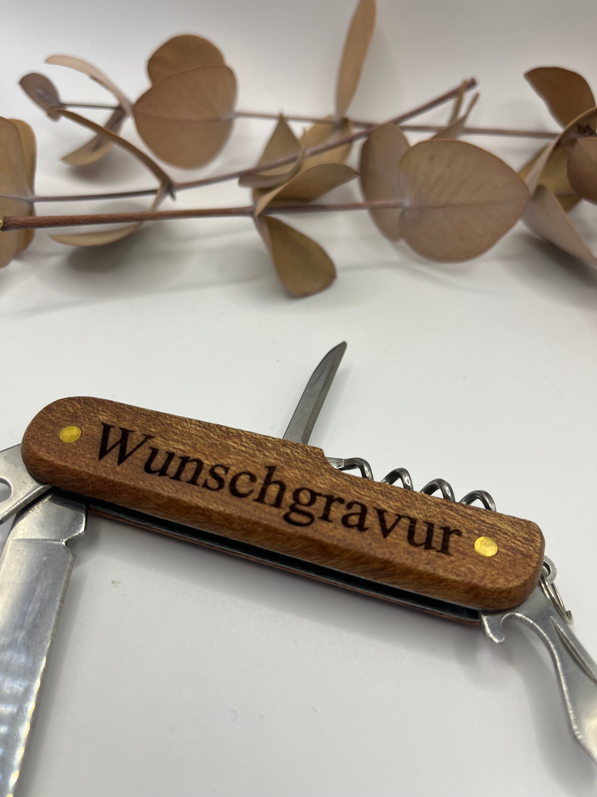 Entdecke unser personalisiertes Multifunktions-Taschenmesser aus erstklassigem Edelstahl und edlem Holz, das speziell für Abenteuerliebhaber wie dich entwickelt wurde! Mit seinen 5 praktischen Funktionen - Korkenzieher, Ahle, Flaschenöffner, Dosenöffner und Messer - bist du bestens für jede Situation gerüstet. Das kompakte Design mit den Maßen 90 x 25 x 12 mm passt perfekt in jede Hosentasche und ist der ideale Begleiter für Campingausflüge, Wanderungen oder den täglichen Gebrauch. Personalisiere es mit deinem Namen oder einer speziellen Botschaft, um es zu einem einzigartigen und unvergesslichen Geschenk zu machen!