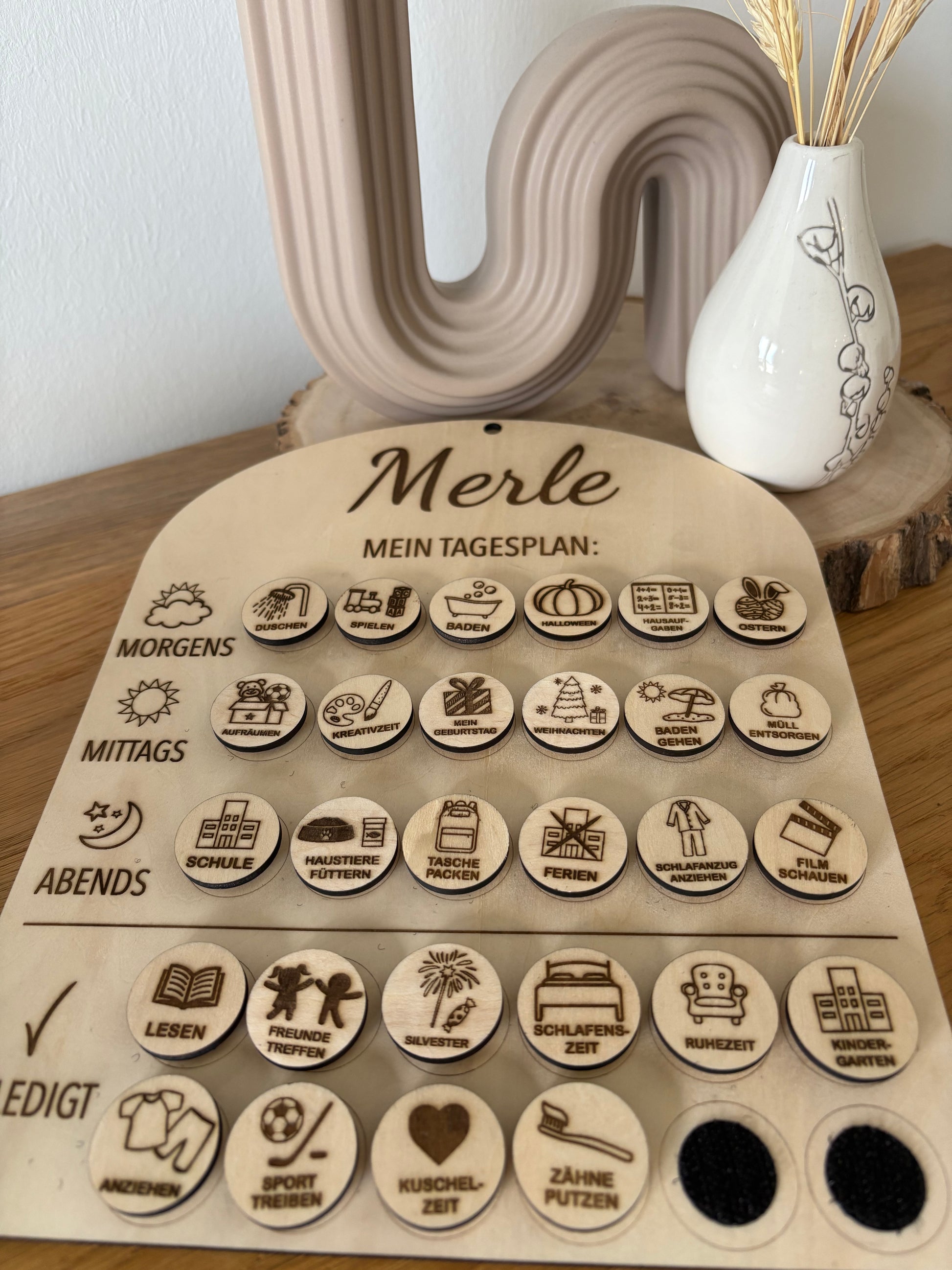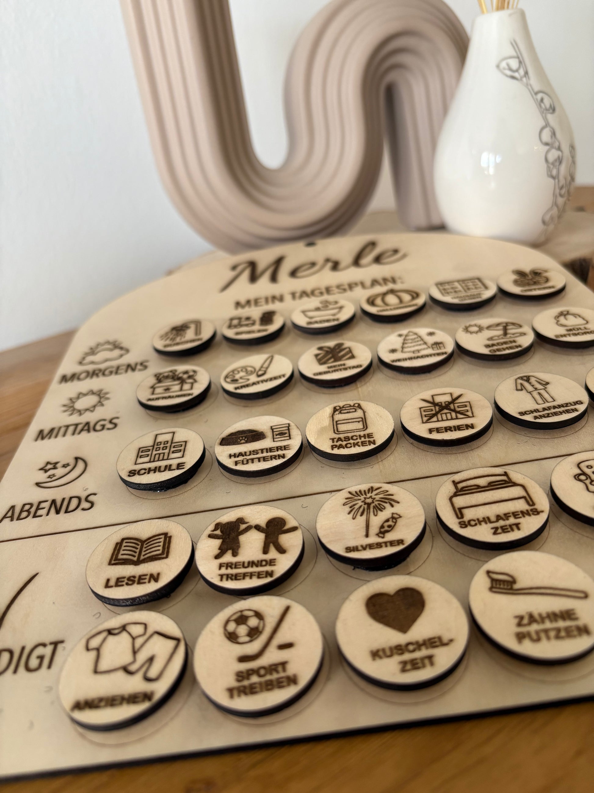 Personalisierter Tagesplan für Kinder aus Holz – mit 28 Aufgabenplättchen